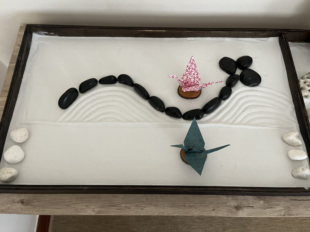 Una de las opciones del Tengoku Cha, permite vivir la experiencia del Karesansui. Creo que lo que más me gusta es la sensación de volverme a hacer niña por un tiempo sin dejar de ser adulta, jugar y volar con las manos, la arena, el palo alisador y los rastrillos… Y al final dejar una huella que si bien es efímera dice tanto de mí y mi momento.