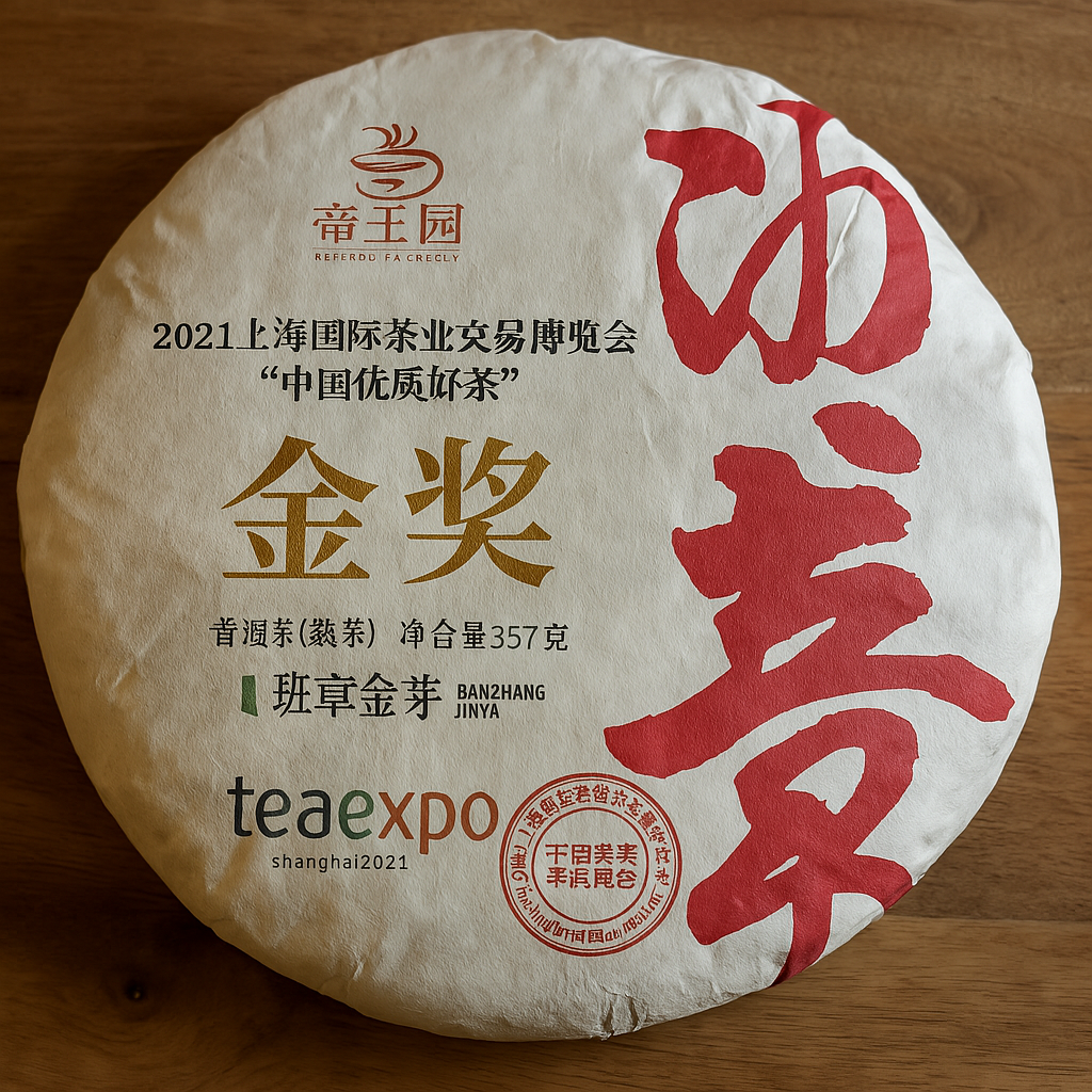 Este Pu-erh proviene de la mítica región de Banzhang, en la provincia de Yunnan, famosa por producir algunos de los tés más valorados del mundo. Pero lo que lo hace aún más especial es su variedad Jinya (“brotes dorados”), compuesta principalmente por hojas jóvenes cubiertas de finos pelillos dorados, cargadas de sabor y nutrientes. Esta torta en particular ha sido elaborada con una maestría que no pasa desapercibida: ganó el «Gold Award» en la Shanghai Tea Expo 2021, una distinción que solo alcanzan tés con un alto equilibrio entre tradición, técnica y carácter.
